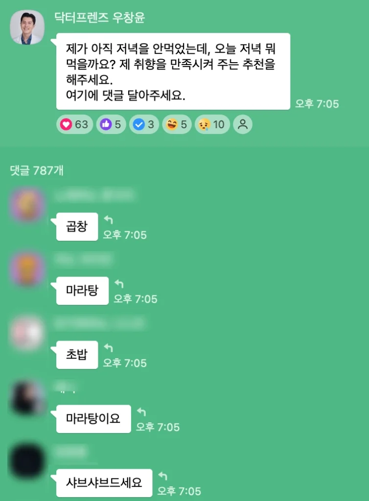저녁 추천 메시지에는 700개가 넘는 댓글이 달렸습니다.