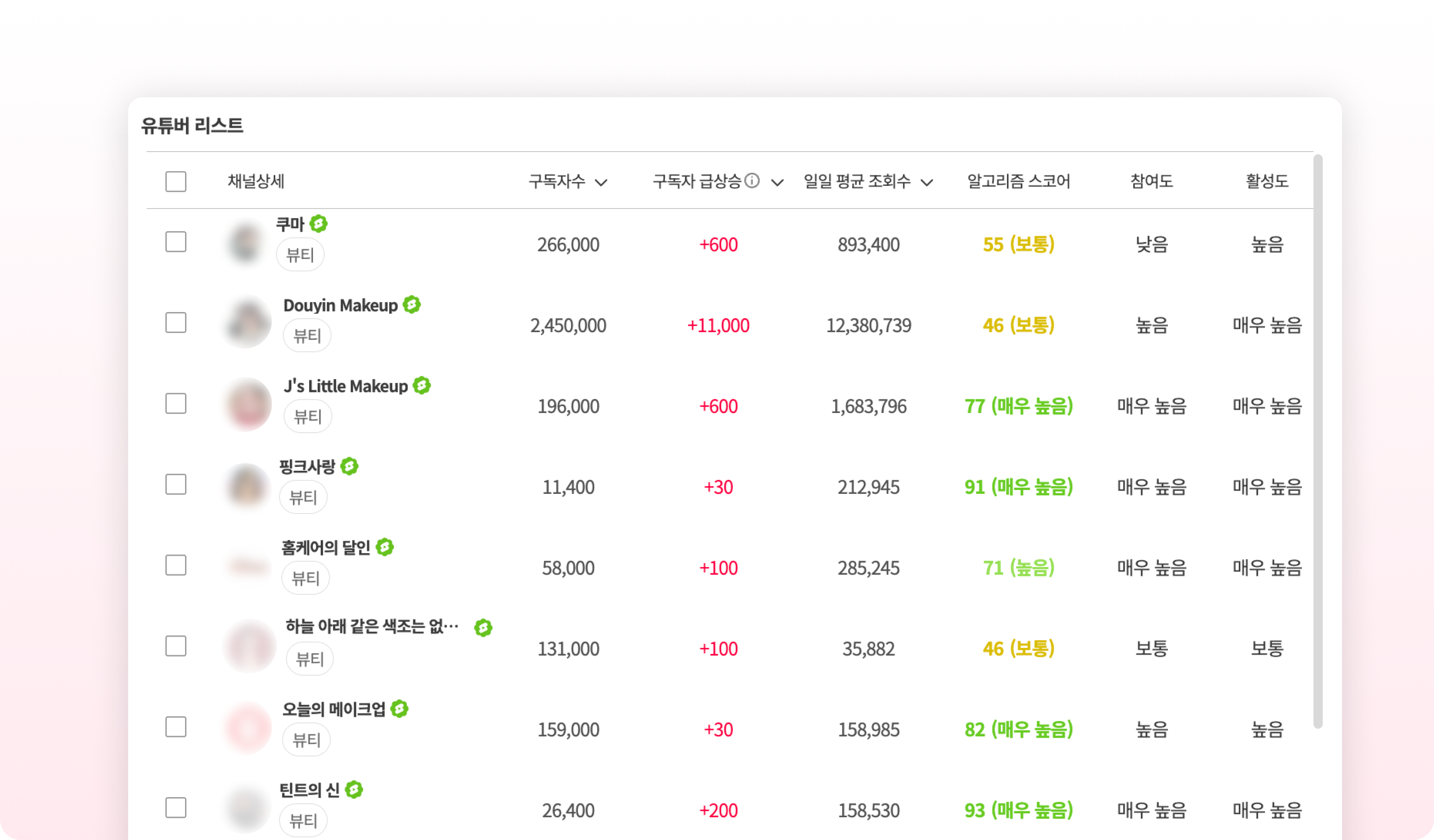 “활성도, 적합도, 광고이력”필터링 가능- 최신 크리에이터 정보 자동 갱신 (삭제, 비활성, 채널 자동 제외)