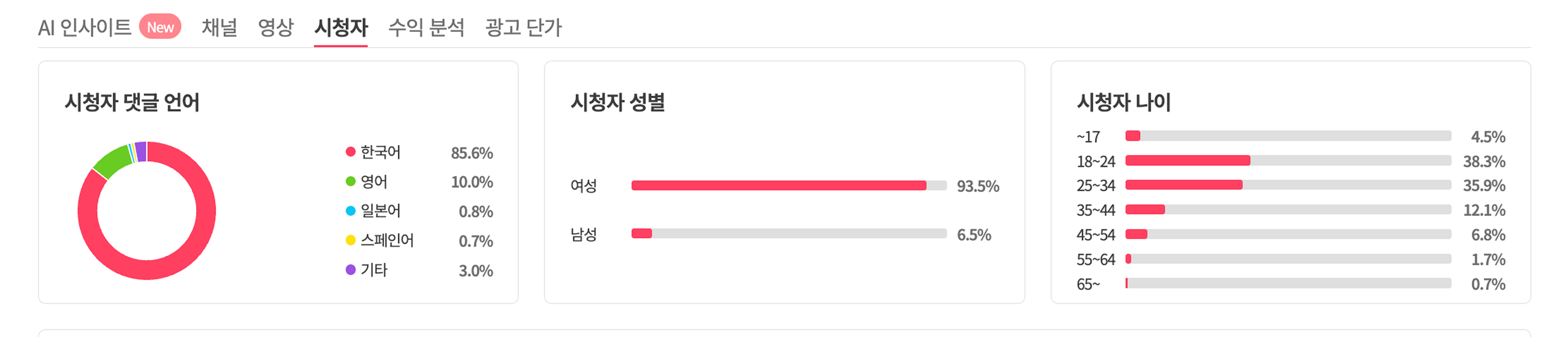 더불어, 댓글 언어, 시청자 성별, 시청자 나이 등