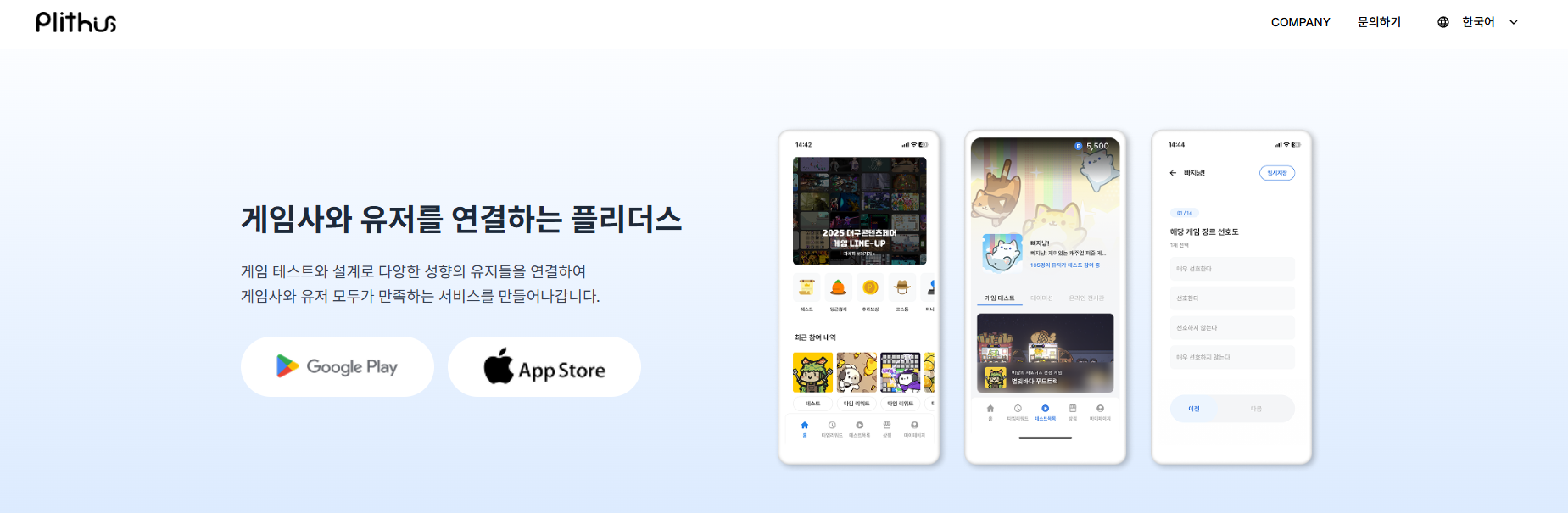 게임을 출시하기 전에, 내가 만든 게임이 유저들에게 잘 통할지 미리 알아볼 수 있다면 좋지 않을까요? 플리더스(PLITHUS)는 정식 출시 전 게임을 실제 유저들이 먼저 플레이해보고, 그 과정에서 나온 의견과 플레이 데이터를 정리해 게임사에 전달해주는 게임 테스트 플랫폼입니다. 약 10만 명의 테스터 유저를 보유하고 있어, 실제 게임 이용자들의 반응을 바탕으로 보다 현실적인 사전 테스트가 가능하다는 점이 강점이라고 하네요.