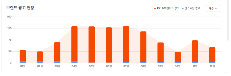 아정당의 광고 현황을 보면 광고 PPL 집행 개수와 조회수 흐름이 거의 동일한 패턴으로 움직이고 있다는 점을 확인할 수 있습니다.