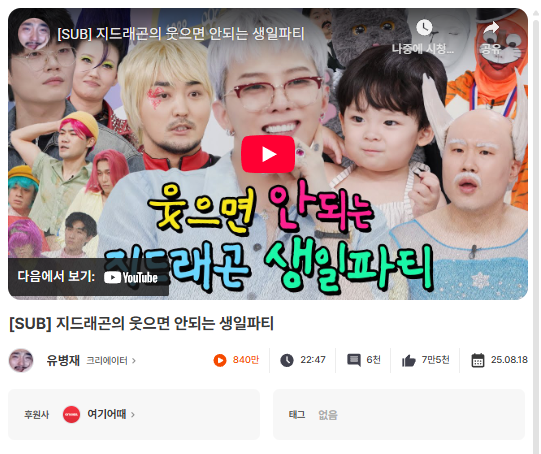 1위는 조회수 약 830만 회로 ‘유병재’ 채널의 [지드래곤의 웃으면 안되는 생일파티]이 되었고
