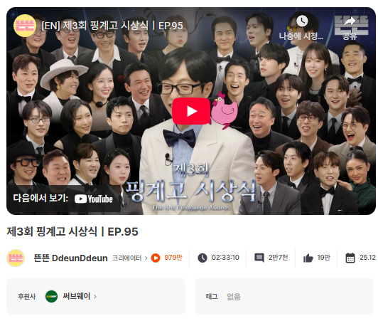 가장 놀라웠던 점은 ‘뜬뜬’ 채널의 [제3회 핑계고 시상식 | EP.95]입니다.