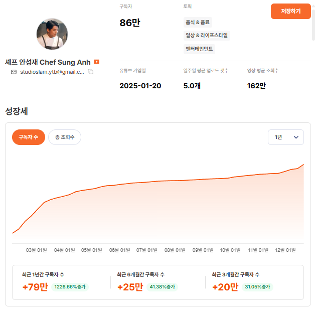 특히 최근 3개월 간 구독자 수가 20만 이상으로 늘면서 흑백요리사 시즌2의 영향을 톡톡히 받고 있습니다.