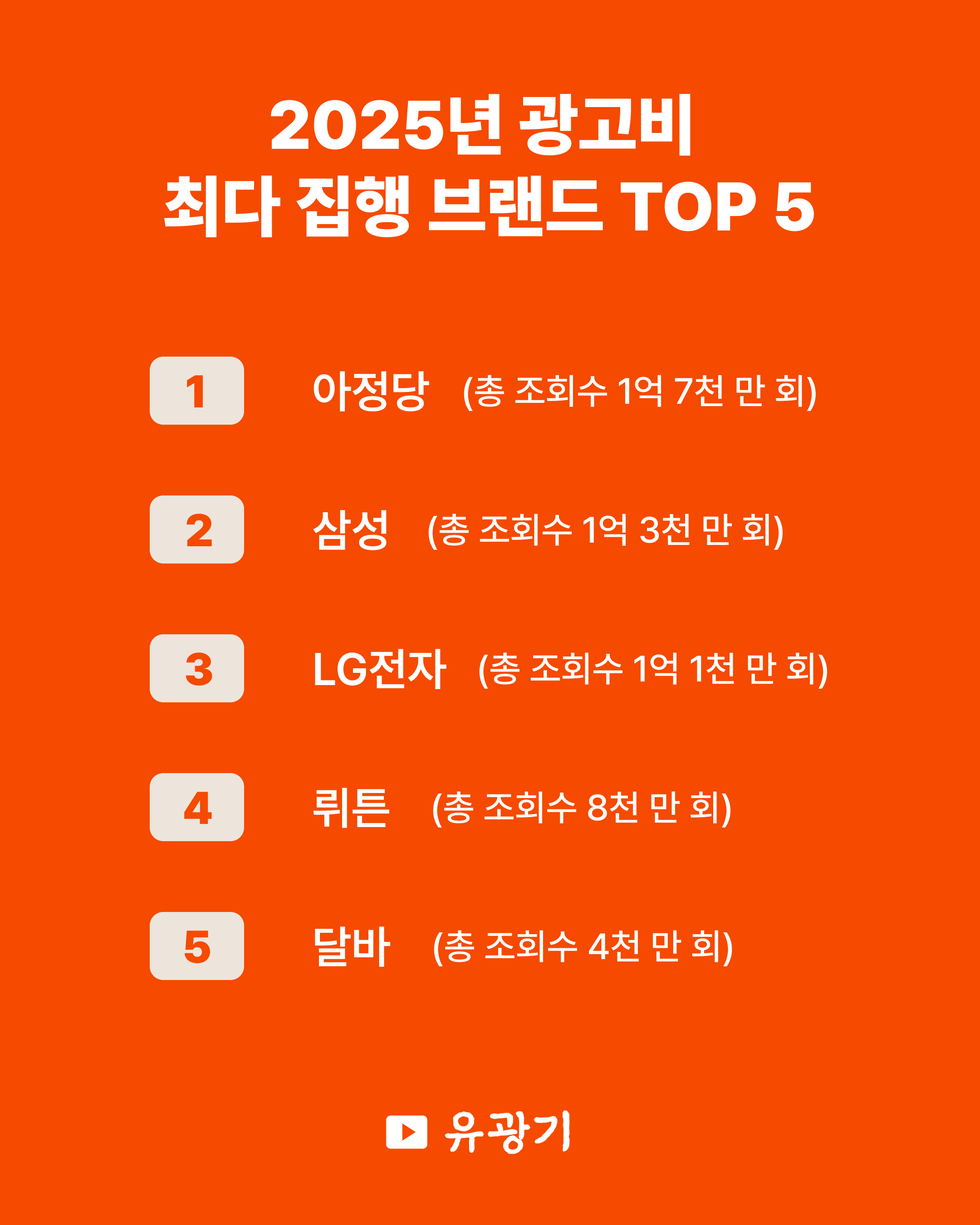2025년 유튜브 광고비 집행 상위 브랜드를 보면 가장 먼저 눈에 띄는 점은 광고비 규모 대비 조회수가 과도하게 높지 않다는 점입니다.