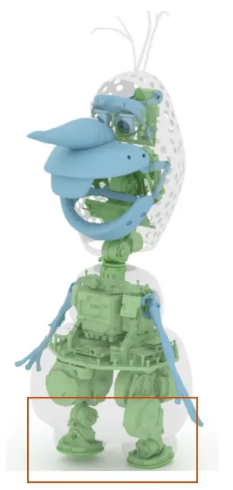 먼저, 올라프의 다리는 좌우가 다르게 설계되었습니다. 올라프의 다리는 눈에 보이지 않아야 하므로 몸통 아래에 완전히 숨겨져 있어야 합니다. 이렇게 좁은 공간 안에 모터와 관절을 넣어야 하다 보니, 움직일 수 있는 범위가 제한되고 왼쪽과 오른쪽 다리가 서로 부딪히기 쉽습니다. 그래서 디즈니 팀은 좌우가 서로 다른 비대칭형 설계를 적용했습니다. 한쪽 다리의 앞뒤 방향을 반대로 배치함으로써 같은 공간에서도 다리가 서로 덜 걸리게 만든 것이죠. 덕분에 다리가 회전할 때의 충돌이 줄어들고, 내부 부품 수도 줄일 수 있었습니다.