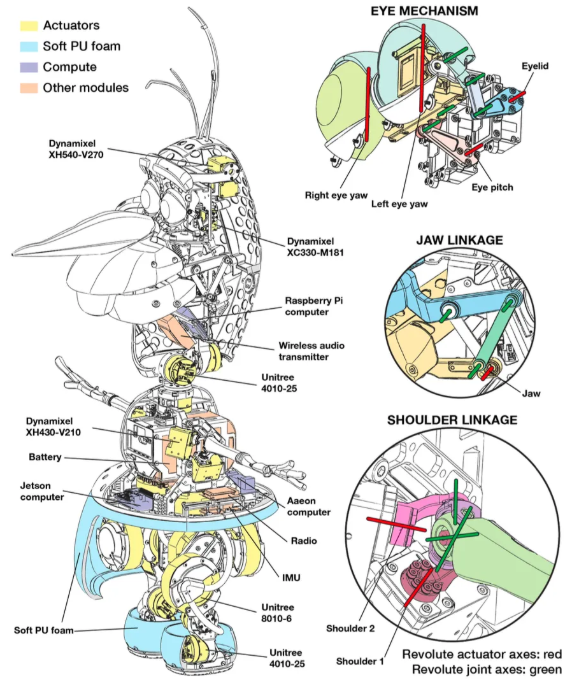 노란색은 모터(Actuators), 파란색은 부드러운 PU 폼 외피(Soft PU foam)이다. 오른쪽 확대 그림은 눈·턱·어깨에서 직접 구동과 원격 구동(링크 전달)이 어떻게 결합되는지 보여준다. 출처: Olaf: Bringing an Animated Character to Life in the Physical World(Müller et al., 2025)
