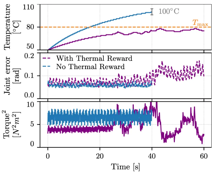 열 보상 유무에 따른 목 모터 온도 변화. 열 보상을 넣기 전(파란색)에는, 40초에 실험을 멈추어야 했으나 열 보상을 넣으면(보라색) 토크 사용을 조절하며 온도를 Tmax(80°C) 근처에서 억제합니다. 출처: Olaf: Bringing an Animated Character to Life in the Physical World(Müller et al., 2025)