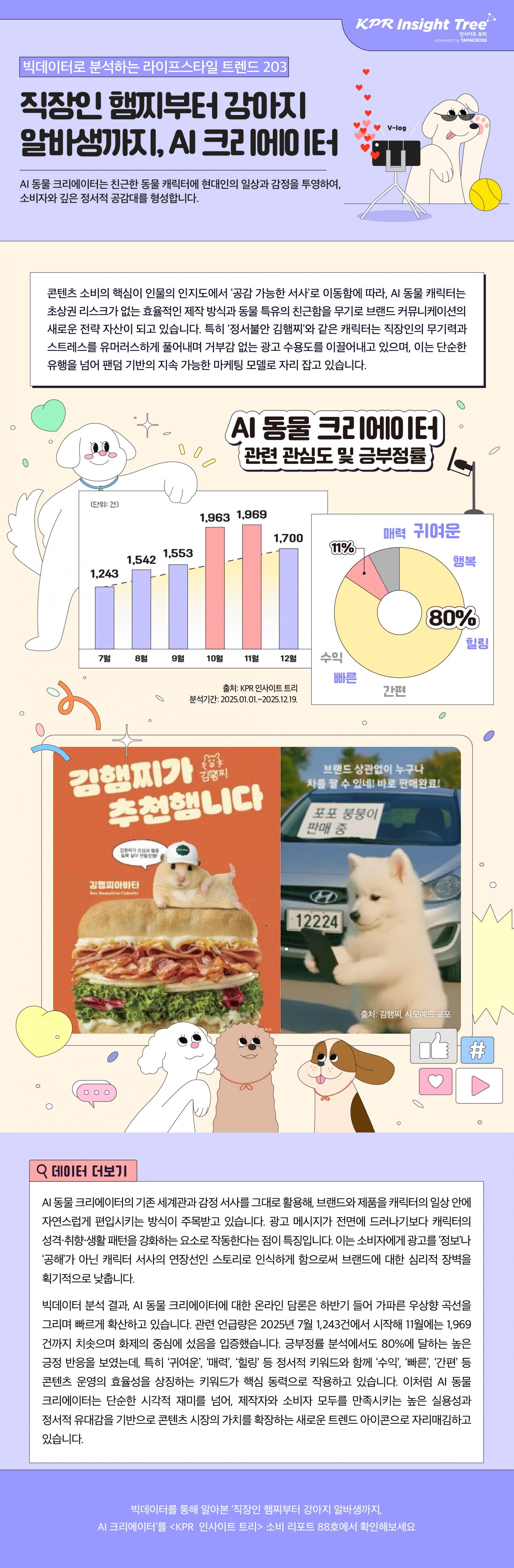 콘텐츠 소비의 핵심이 인물의 인지도에서 ‘공감 가능한 서사’로 이동함에 따라, AI 동물 캐릭터는 초상권 리스크가 없는 효율적인 제작 방식과 동물 특유의 친근함을 무기로 브랜드 커뮤니케이션의 새로운 전략 자산이 되고 있습니다. 특히 '정서불안 김햄찌'와 같은 캐릭터는 직장인의 무기력과 스트레스를 유머러스하게 풀어내며 거부감 없는 광고 수용도를 이끌어내고 있으며, 이는 단순한 유행을 넘어 팬덤 기반의 지속 가능한 마케팅 모델로 자리 잡고 있습니다.