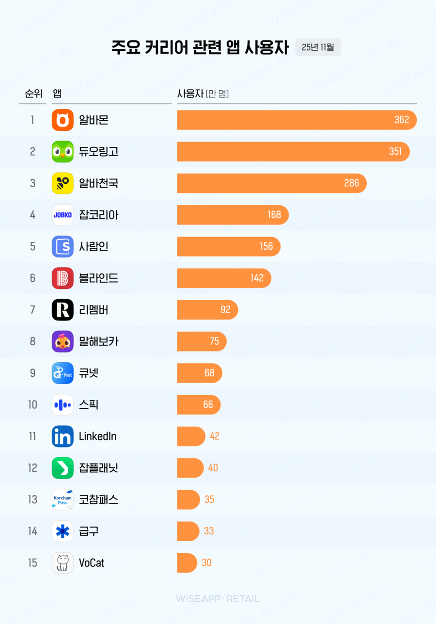 2025년 11월 한국인이 가장 많이 사용한 커리어 관련 앱은 '알바몬'으로 월간 사용자 수 362만 명을 기록했어요.