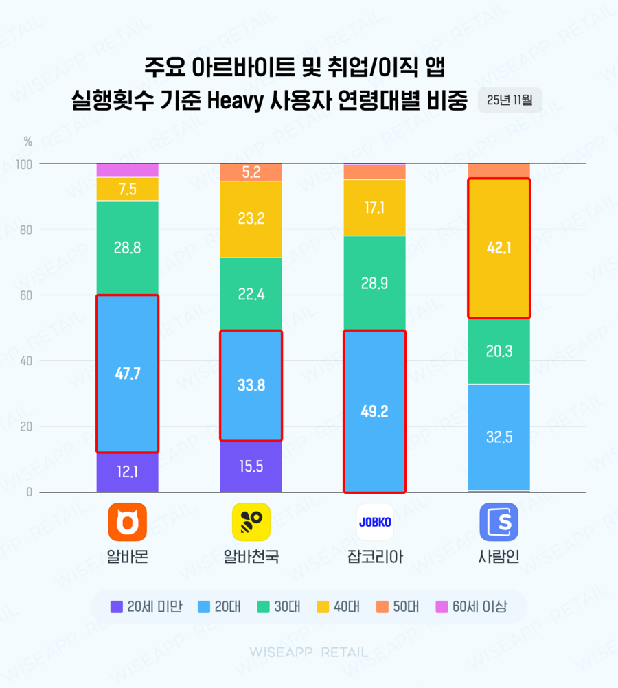커리어 앱을 매우 자주 실행하고 있는 Heavy 사용자의 연령대별 실행횟수 비중은 어땠을까요? 2025년 11월 기준 앱 사용자 100만 명이 넘는 주요 커리어 관련 앱을 조사한 결과, 알바몬, 알바천국, 잡코리아의 실행횟수 헤비 유저는 20대 비율이 가장 높았으며, 사람인의 경우 40대의 헤비 유저 비율이 가장 높은 것으로 나타났어요.