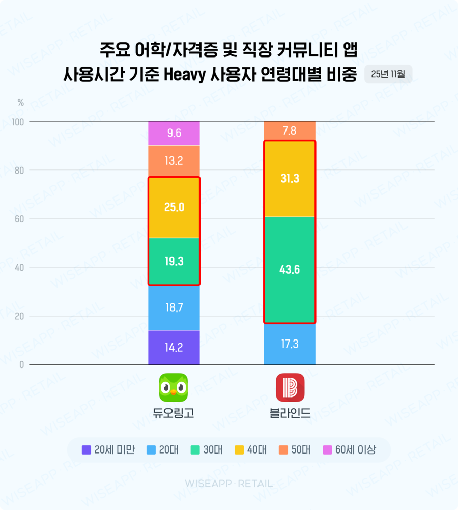 다만, 듀오링고는 전 연령대에 걸쳐 이용자가 고르게 분포된 반면, 블라인드는 직장 커뮤니티 앱 특성상 30대와 40대에 헤비 유저 비율이 집중됐다는 차이가 있었어요.