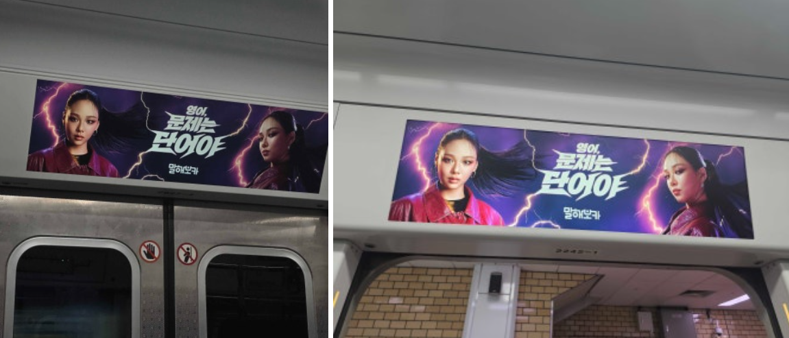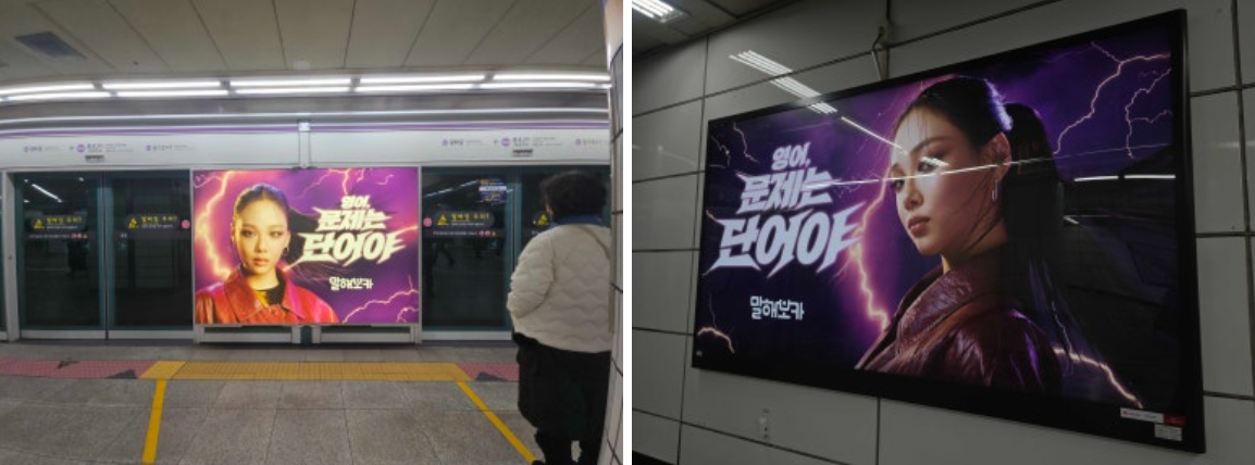 • 지하철 스크린도어 및 역사 내 광고 – 지하철 1/3/5호선 환승역인 종로3가역의 5호선 스크린도어에 광고를 집행했습니다. 환승 대기 중인 유동 인구에게 노출을 극대화하려는 의도로, “영어, 문제는 단어야” 카피와 보라색 배경의 강렬한 비주얼을 동일하게 적용했습니다. 또한 지하철 7/9호선이 지나는 논현역의 역사 내부에도 설치해 논현 지역 출퇴근 직장인들을 타겟하였습니다. 이는 환승객과 인근 상업지구 방문객이 많아 체류 시간이 긴 역사 환경을 공략한 전략입니다.