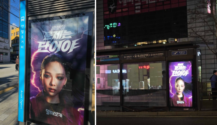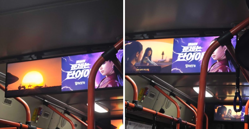 • 버스 내부 디지털 광고 – 차량 내 디지털 모니터를 활용해 출퇴근 시간대 버스 이용객에게 반복 노출을 유도했습니다. “바보야, 문제는 단어야” 문구와 함께 광고 영상을 함께 구성해 승객의 시선이 머무는 공간에서 브랜드 메시지를 직관적으로 전달했습니다.