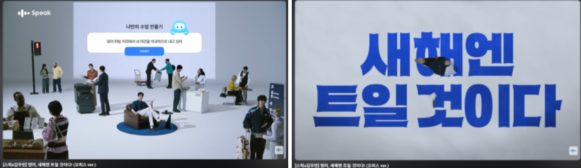 스픽은 브랜드 컬러인 블루 톤을 모든 소재에 일관되게 적용해 깨끗하고 전문적인 이미지를 주었으며, 광고 비주얼에는 앱 UI 화면과 음성인식 시연 장면을 넣어 앱의 실용성을 강조했습니다. 김우빈이 실제 스픽 앱으로 영어 문장을 말하고 교정받는 모습을 보여줌으로써 “직접 말하며 배우는 AI튜터”라는 서비스 특징을 직관적으로 전달한 것입니다.