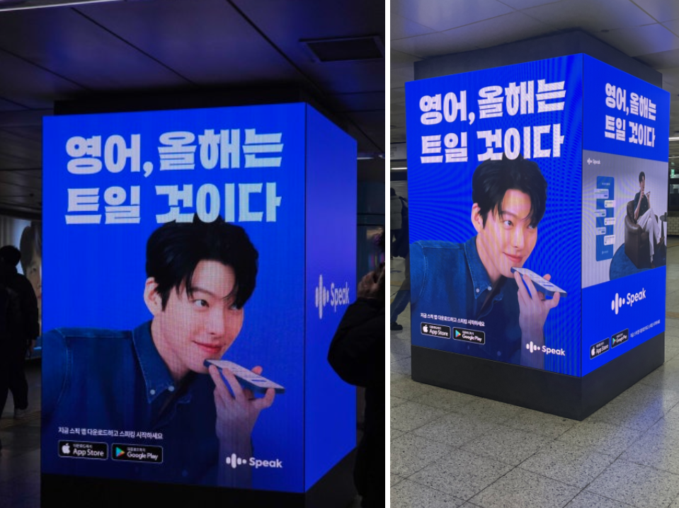• 지하철 역사 디지털 사각기둥 광고 – 서울 지하철 2호선 잠실역, 건대입구역 등 유동인구가 매우 많은 환승역사 내에 사각기둥 광고를 활용함으로써, 역사 내부 어떤 방향에서든 캠페인 영상과 이미지를 볼 수 있도록 했습니다. 새해를 겨냥한 “영어, 올해는 트일 것이다”라는 카피와 함께 김우빈 모델이 앱으로 영어 말하기를 시연하는 장면을 담아, 지나가는 이들이 제품 기능까지 한눈에 접하도록 구성했습니다. 환승 동선 상에 배치하여 출퇴근길 직장인과 통학길 대학생들에게 입체적이고 반복적인 메시지 노출을 확보한 것이 포인트입니다.