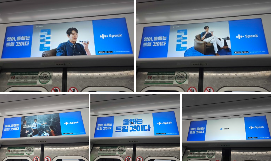 • 지하철 2호선 메트로라이브 – 말해보카와 마찬가지로 지하철 2호선 전동차 내부 천장 디지털 스크린을 활용했습니다. 광고 이미지를 수초 동안 일정하게 노출시킨 말해보카와 달리, 스픽의 경우 여기에 앱 UI 화면과 캐릭터를 시각화하여, 이동 중인 승객들이 앱 사용 경험을 간접 체험할 수 있게 한 점이 다릅니다. 영어 문장을 말하면 AI가 교정해주는 앱 화면을 광고 영상으로 보여줘, 이동 시간 동안 제품 기능과 혜택을 인지시켰습니다. 이는 단순 로고나 슬로건 노출을 넘어 하나의 '브랜드 체험형 광고'로서 역할을 한 셈입니다.