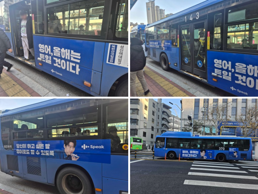 • 버스 외부 래핑 광고 – 스픽도 서울 시내 버스 래핑을 통해 도심 곳곳에 메시지를 확산시켰습니다. 선정 노선은 주거지역과 서울 도심, 압구정, 삼성을 잇는 143번, 서울 도심, 천호, 주거지역을 잇는 370번 버스 등으로, 출퇴근 이동 경로상 직장인 밀집 지역을 커버하도록 기획되었습니다. “영어, 올해는 트일 것이다”, “당신이 하고 싶은 말, 영어로도 할 수 있도록” 문구를 활용했습니다. 또한 버스 광고는 도로 위 이동형 매체로서, 승객뿐 아니라 길거리의 보행자와 운전자에게도 노출되므로 메시지 파급 범위를 극대화했습니다.