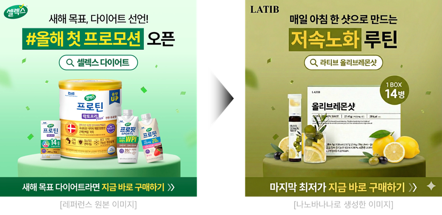 먼저 기존 레퍼런스 이미지에서 제품을 자사 제품으로 교체해보겠습니다. 레퍼런스 이미지와 변경할 제품 이미지를 준비한 뒤 프롬프트를 입력해 주세요. 이때 ‘기존 이미지의 구성 요소를 유지해 달라’는 조건을 함께 명시하는 것이 중요합니다. 해당 요청이 누락될 경우 AI가 임의로 새로운 디자인을 적용할 수 있기 때문입니다. 또한, 상품의 개수·크기·방향 등을 구체적으로 제시할수록 결과물의 완성도도 높아집니다.