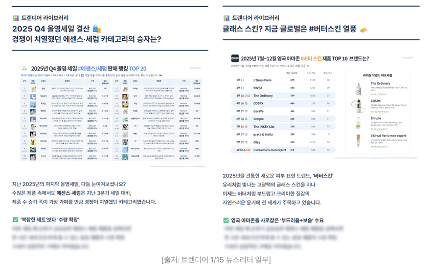 이처럼 경쟁이 치열해질수록 트렌드를 얼마나 빠르고 정확하게 읽느냐가 마케팅 성과를 좌우합니다. 어떤 성분이 주목받고 있는지, 어떤 패키지가 반응을 얻는지, 소비자들이 어떤 메시지에 반응하는지—이 모든 흐름을 놓치지 않는 것이 뷰티 마케터의 기본 역량이 되고 있습니다.
