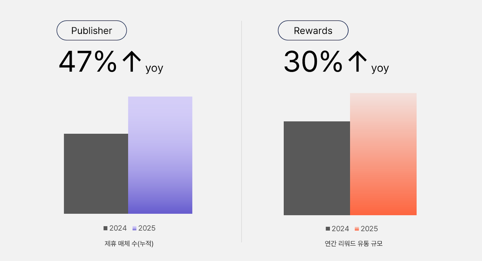 이러한 구조적 안정화는 곧 리워드 유통 규모와 캠페인 수의 동반 상승으로 이어졌습니다. 연간 지급 리워드 금액은 전년 대비 30% 이상 증가했으며, 집행 캠페인 수 또한 전년 대비 약 21% 성장했습니다. 연말에는 월간 리워드 지급액이 14억 원 규모에 육박하며, 어떤 규모의 캠페인도 안정적으로 소화할 수 있는 거대한 트래픽 수익화 기반이 마련되었음을 증명했습니다.