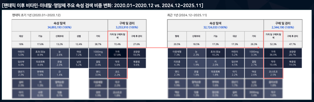 놀라운 발견 중 하나는 소비자들이 더 이상 '최저가'에만 매몰되지 않는다는 것입니다. 최근 1년 비타민/미네랄/영양제 카테고리 검색 데이터를 분석한 결과, 가격 관련 검색 비중이 팬데믹 초기 대비 무려 21.8%p 감소했습니다.