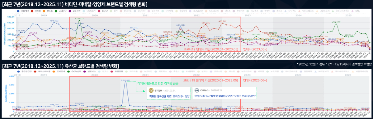 - 비타민C, 비타민K, 철분 검색량은 팬데믹 기간보다 엔데믹 후에 검색량이 보다 늘었으며, 오메가3, 아르기닌, 글루타치온,콘드로이친/MSM 등은 팬데믹 이전에 비해 최근 검색량이 더 높아졌습니다.