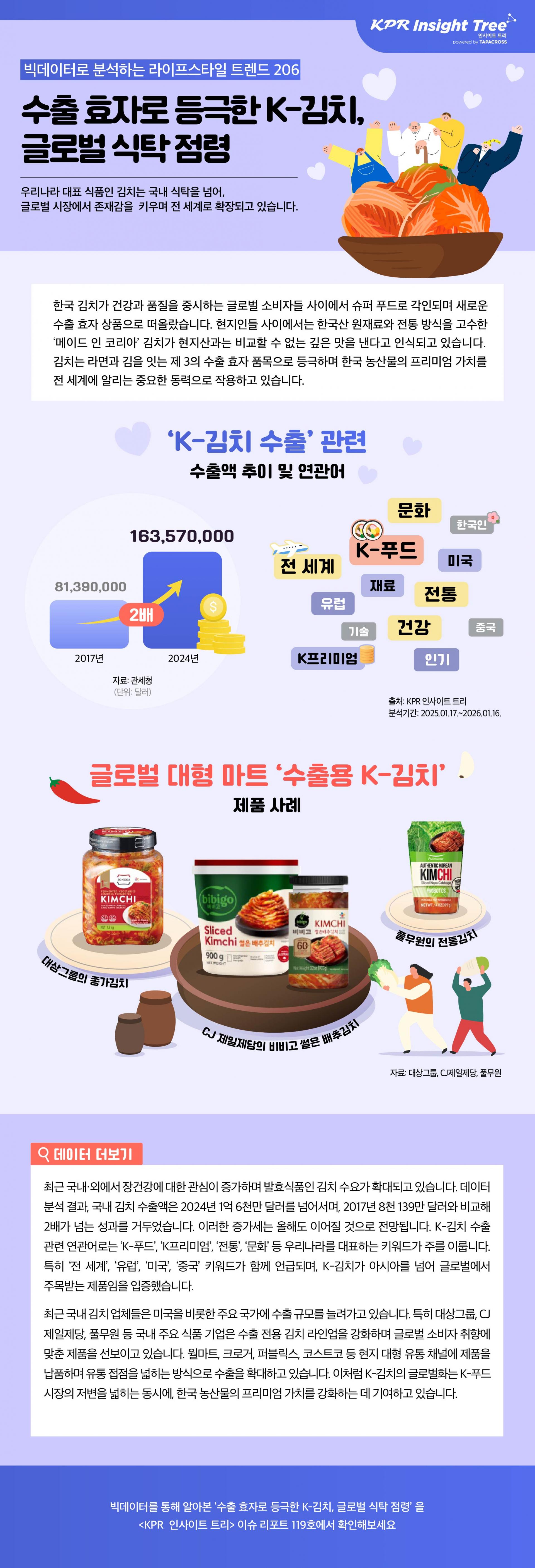- 우리나라 대표 식품인 김치는 국내 식탁을 넘어, 글로벌 시장에서 존재감을 키우며 전 세계로 확장되고 있습니다.