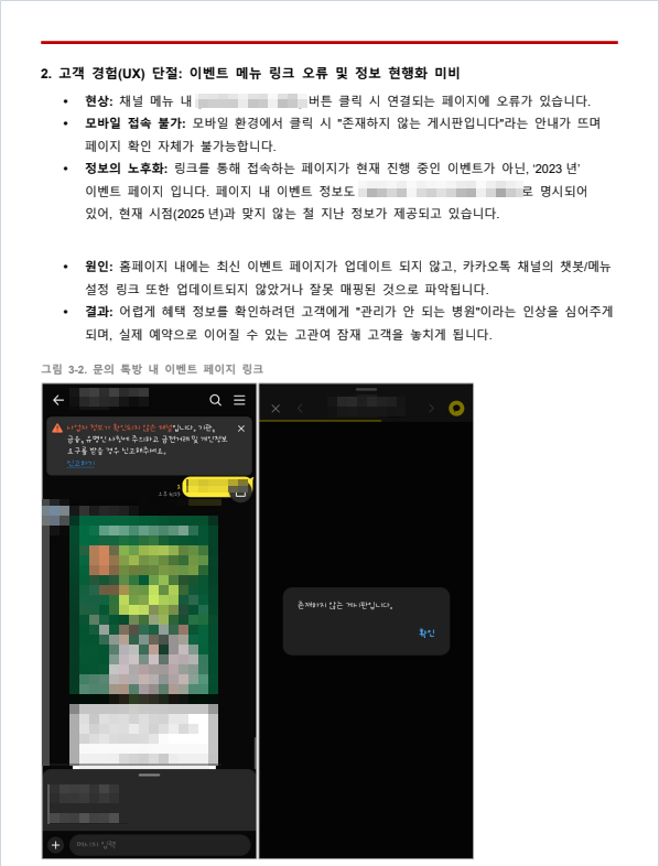 모바일에서 열리지 않거나 오래된 정보가 그대로 노출 이 부분은 병원 이미지에 직접적인 영향을 줄 수 있어 우선 개선이 필요한 사항으로 정리되었습니다.
