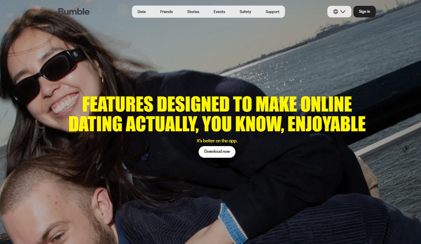 1. 여왕벌이 중심이 되는 꿀벌 생태계가 연상되는 '범블(bumble)'을 브랜드 이름으로 정하고, 강렬한 노란색 컬러를 사용해 기존 데이팅 앱(분홍색, 붉은색 등)과 비주얼적으로 확실한 차이를 만듭니다.