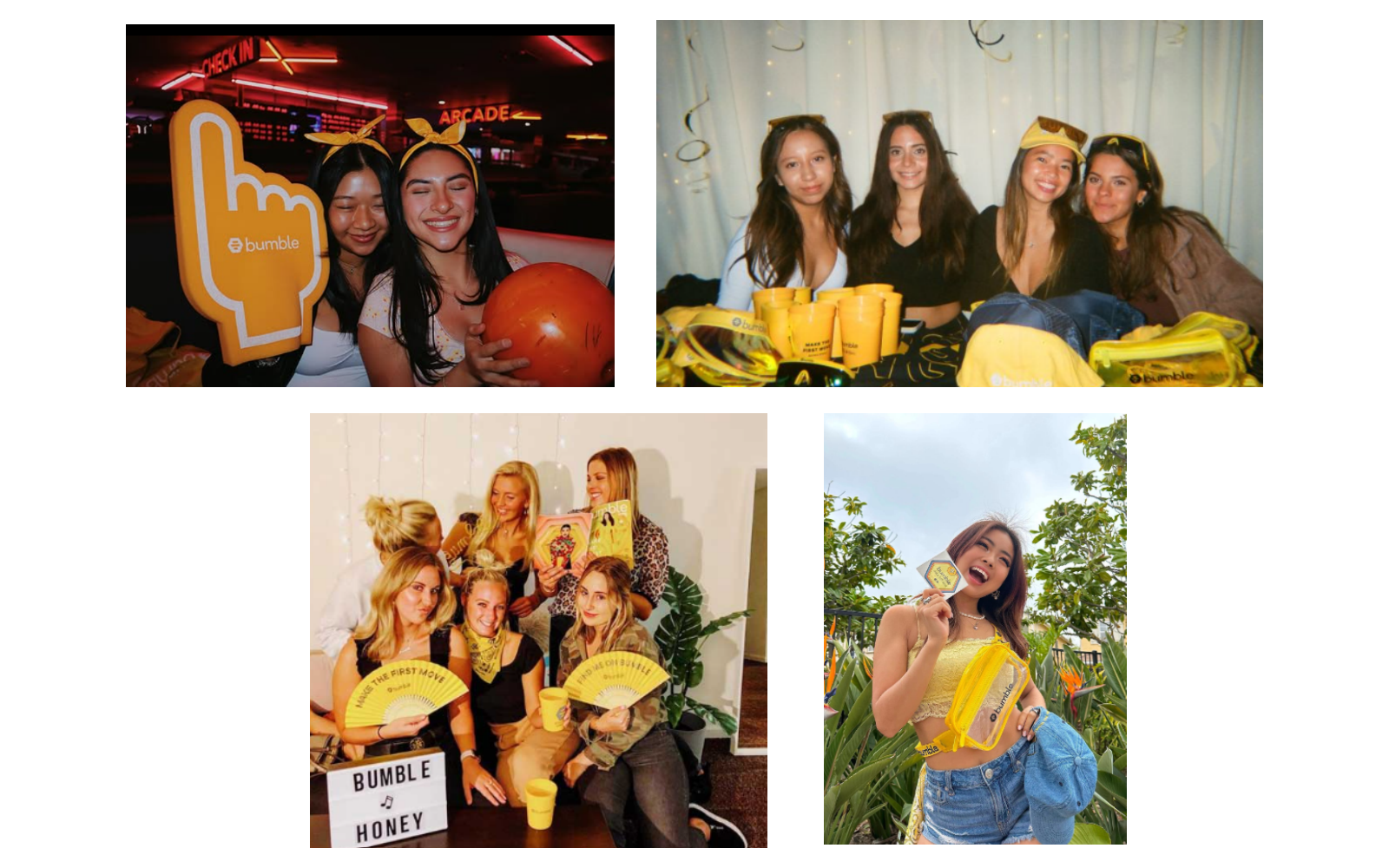 학생들은 교실에서, 캠퍼스에서, 파티에서 범블의 강렬한 노란색을 반복적으로 마주하게 됩니다. 적어도 이 대학 내에서 범블은 틴더보다 훨씬 더 핫한 데이팅앱이 됩니다. (=밀도가 높은 마케팅 활동을 통한 대세감 확보)