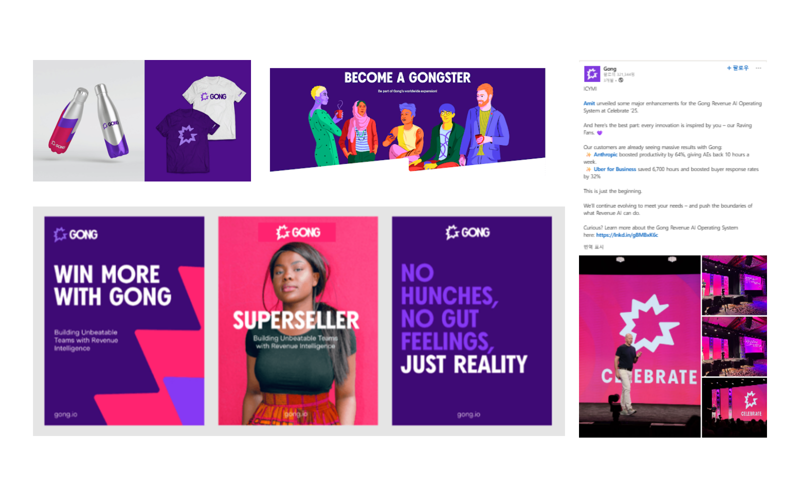 4. 오프라인 컨퍼런스에 뛰어난 성과를 냈던 세일즈 리더들을 초대했습니다. 모두 GONG이 제공한 굿즈를 입고 현장에 참석하도록 요청했습니다. 더 많은 잠재 고객들(=또 다른 세일즈 리더들)이 GONG의 강렬한 브랜드 이름과 컬러를 '뛰어난 세일즈 성과'와 연결 지어 인지하게 됐습니다.