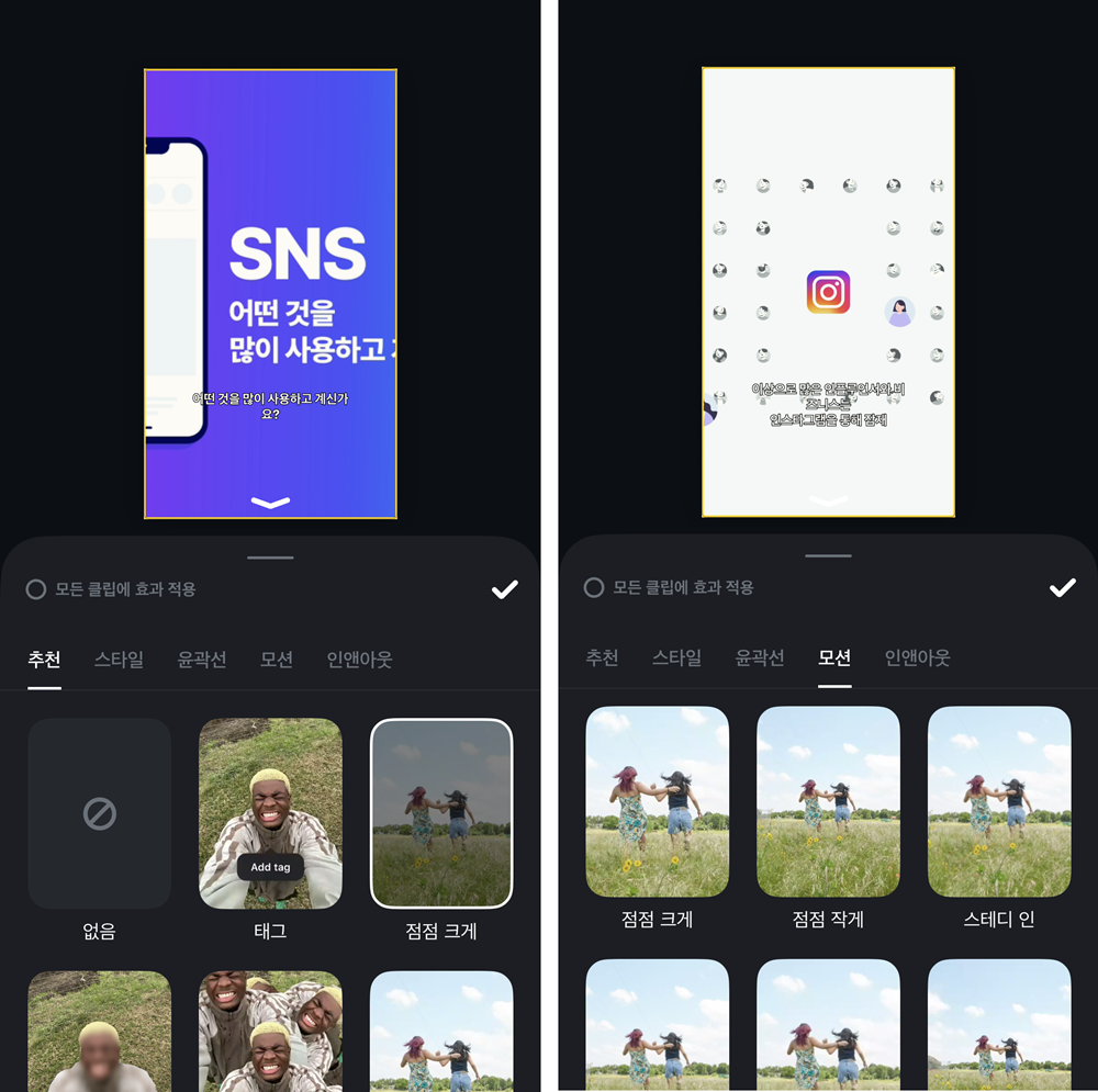특히 중요한 장면을 강조하고 싶거나, 콘테츠에 포인트를 주고 싶을 때 클립에 효과를 적용하면 보다 몰입감 있는 영상미를 연출할 수 있어요.