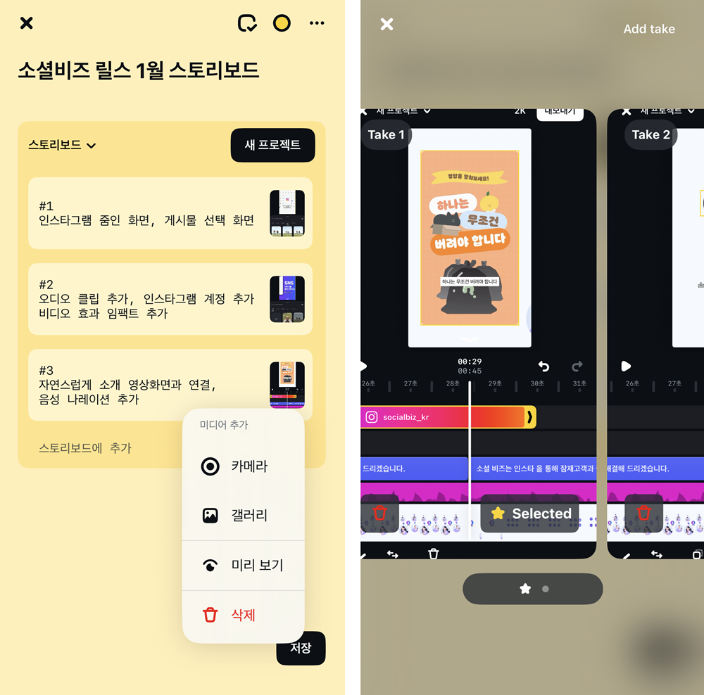 이전까지는 한 프로젝트 안에 단일 영상이나 오디오만 추가해 간단한 편집 위주의 스토리보드 기능이었는데요. 이번 업데이트로 스토리보드 내 여러 개의 영상 테이크와 오디오 트랙을 동시에 추가해 비교할 수 있어요.