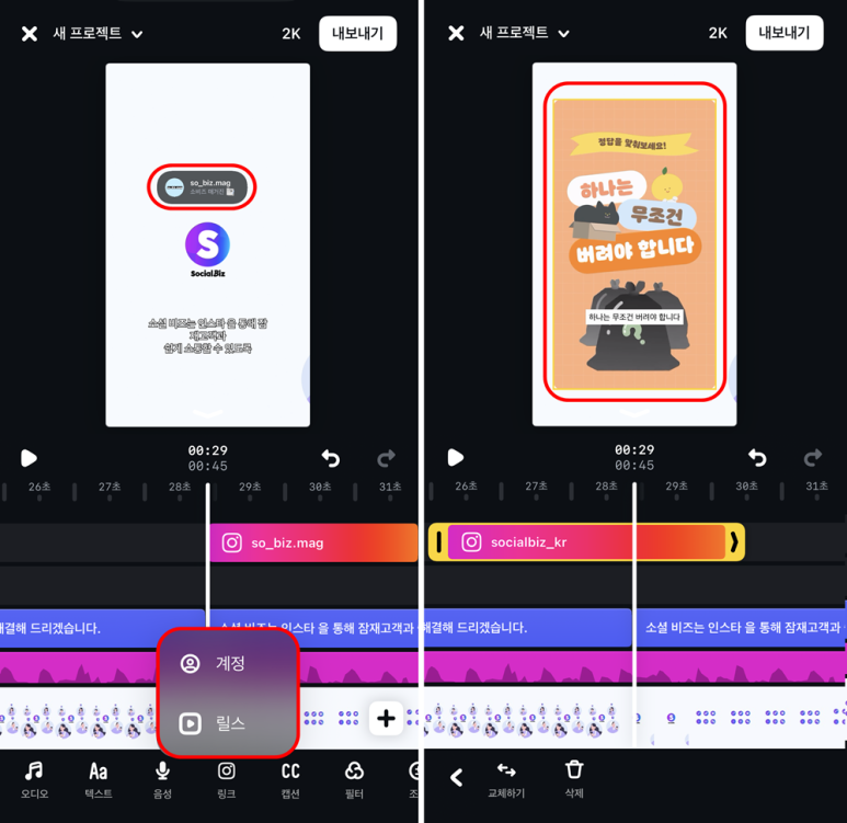 인스타그램 계정과 릴스를 영상에 추가하고 연결하기