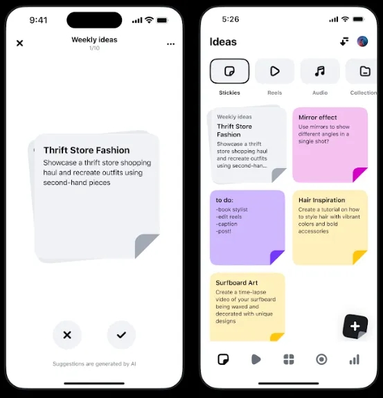 Weekly ideas 란 이름으로 내가 이전에 제작했던 릴스를 분석해서 에디츠에서 추천해 줌으로써 다음 콘텐츠 방향을 정하는 데 큰 도움이 될 거예요.