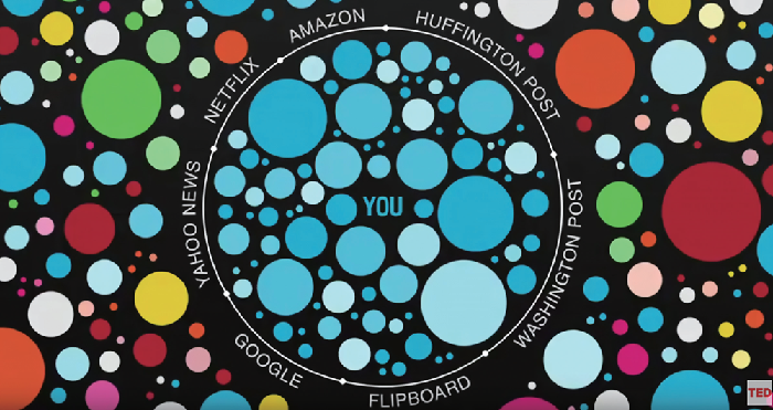 미국 시민운동가 일라이 파리저의 TED 강연 ‘온라인 필터 버블을 경계하라’에서 사용된 대표적 시각 자료로, 필터 버블 현상을 직관적으로 보여주고 있다. ©TED