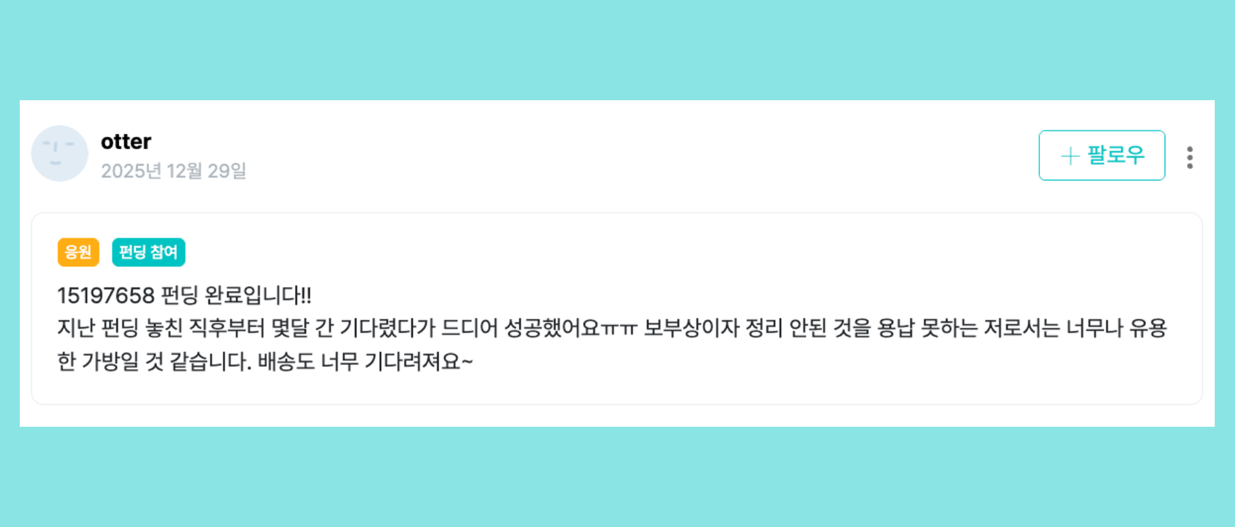 이런 긍정적인 리뷰 등을 통해 확인할 수 있듯이, 서포터들은 단순히 물건을 받는 것이 아니라 '새로운 브랜드의 탄생에 참여한다'는 가치에 집중하고 있기 때문에 브랜드의 배송 부담이 상대적으로 적어요.
