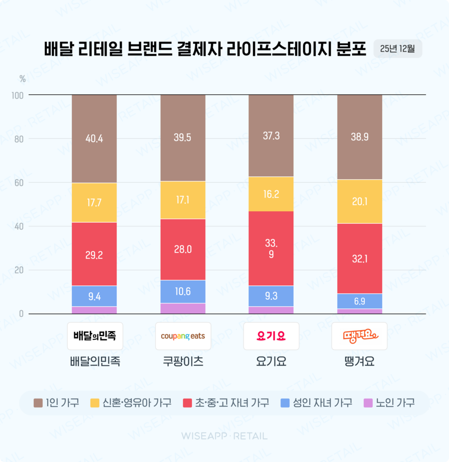 라이프스테이지 분포도 살펴볼까요? 지난해 12월 배달 앱 4사의 결제자 라이프스테이지는 모든 플랫폼에서 1인 가구와 초∙중∙고 자녀 가구의 비율이 가장 높게 나타났습니다.