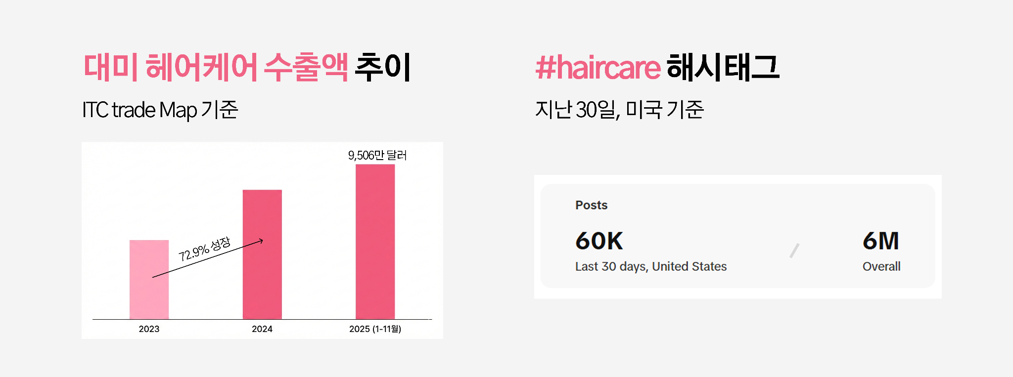 한국의 2025년 1~11월 대미 헤어케어 누적 수출액은 9,506만 달러를 기록하며 이미 전년도 수치를 뛰어넘었습니다. 특히 2023년에서 2024년 사이 전년 대비 72.9%라는 폭발적인 성장률을 보이며, K-뷰티가 스킨케어에서 헤어케어로 영역을 확장하는 데 성공했음을 입증했죠.