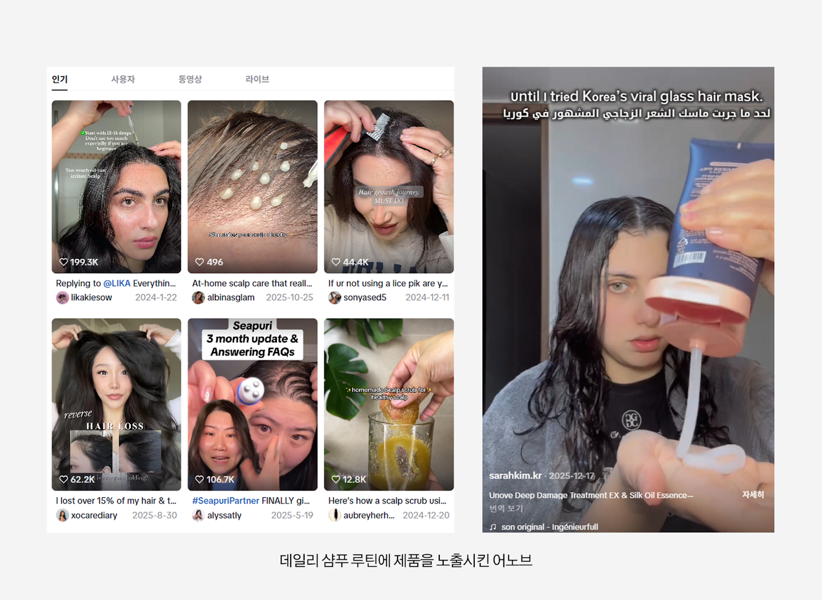 26년 1월 기준, 지난 한 달 동안 틱톡에서 높은 조회수와 인게이지먼트를 동시에 달성한 K-뷰티 콘텐츠를 분석한 결과, 비주얼보다 즉각적인 효과 및 B&A(비포 앤 애프터)를 강조하는 콘텐츠 포맷이 많았습니다. 그리고 이 포맷은 헤어케어 제품 콘텐츠에 적용되었을 때도 동일한 효과를 낼 것으로 전망되고 있습니다.