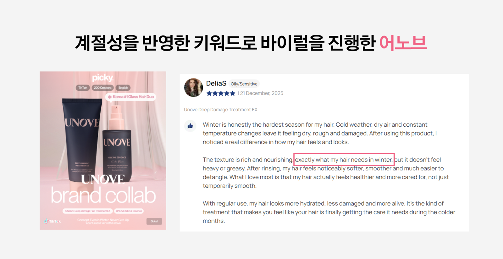 제품을 정의할 수 있는 핵심 키워드를 제대로 발굴해야 콘텐츠 바이럴의 모멘텀을 얻을 수 있습니다. 이때, 핵심 키워드를 계절성이나 바이럴 하고픈 지역의 특징에 맞춰 설계하는 것도 효과적인 방법입니다. 실제로 피키와 함께 캠페인을 진행한 어노브의 경우, 모발이 건조하고 푸석해지기 쉬운 겨울 시즌 바이럴을 위해 ‘Winter glass hair’ 키워드를 집중적으로 내세워 콘텐츠 바이럴에 성공했습니다.