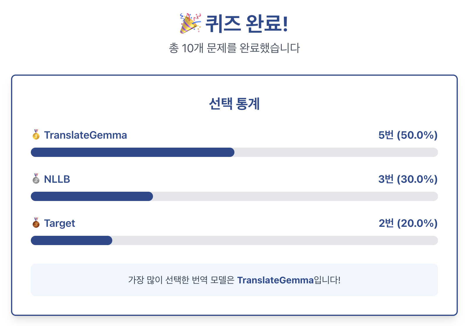 어떤가요? 각 모델의 특징이 보이시나요? 개인적으로는 흥미로운 결과라는 생각이 들었습니다. 말로만 무성한 모델의 실체를 직관적으로 비교할 수 있으니까요. 여러분이 직접 블라인드 테스트를 할 수 있도록 Claude Artifact를 활용해 퀴즈를 만들었습니다. 10개의 예제가 포함되어 있으니, 가장 좋은 번역을 선택해보고 비교해보세요.