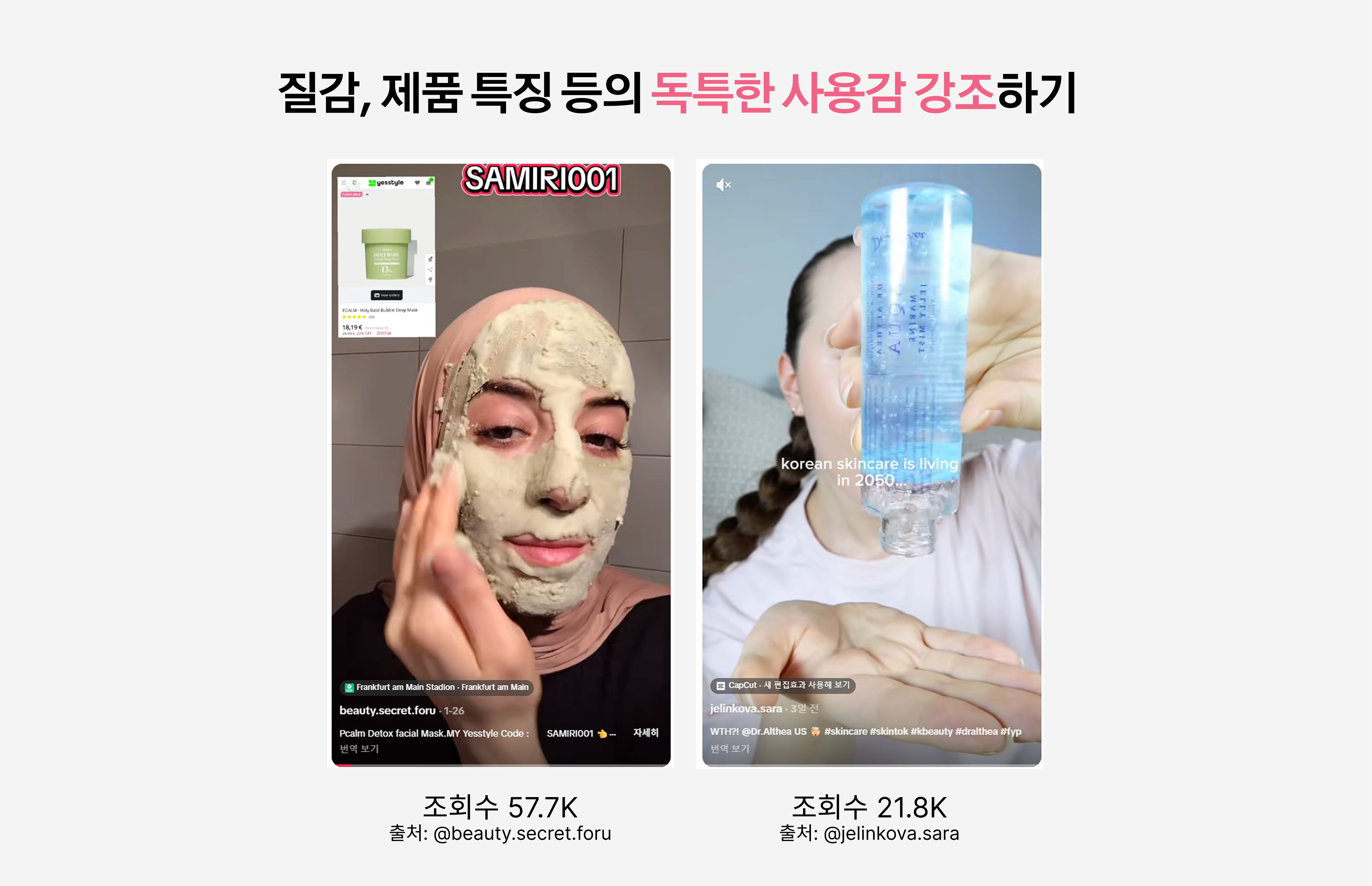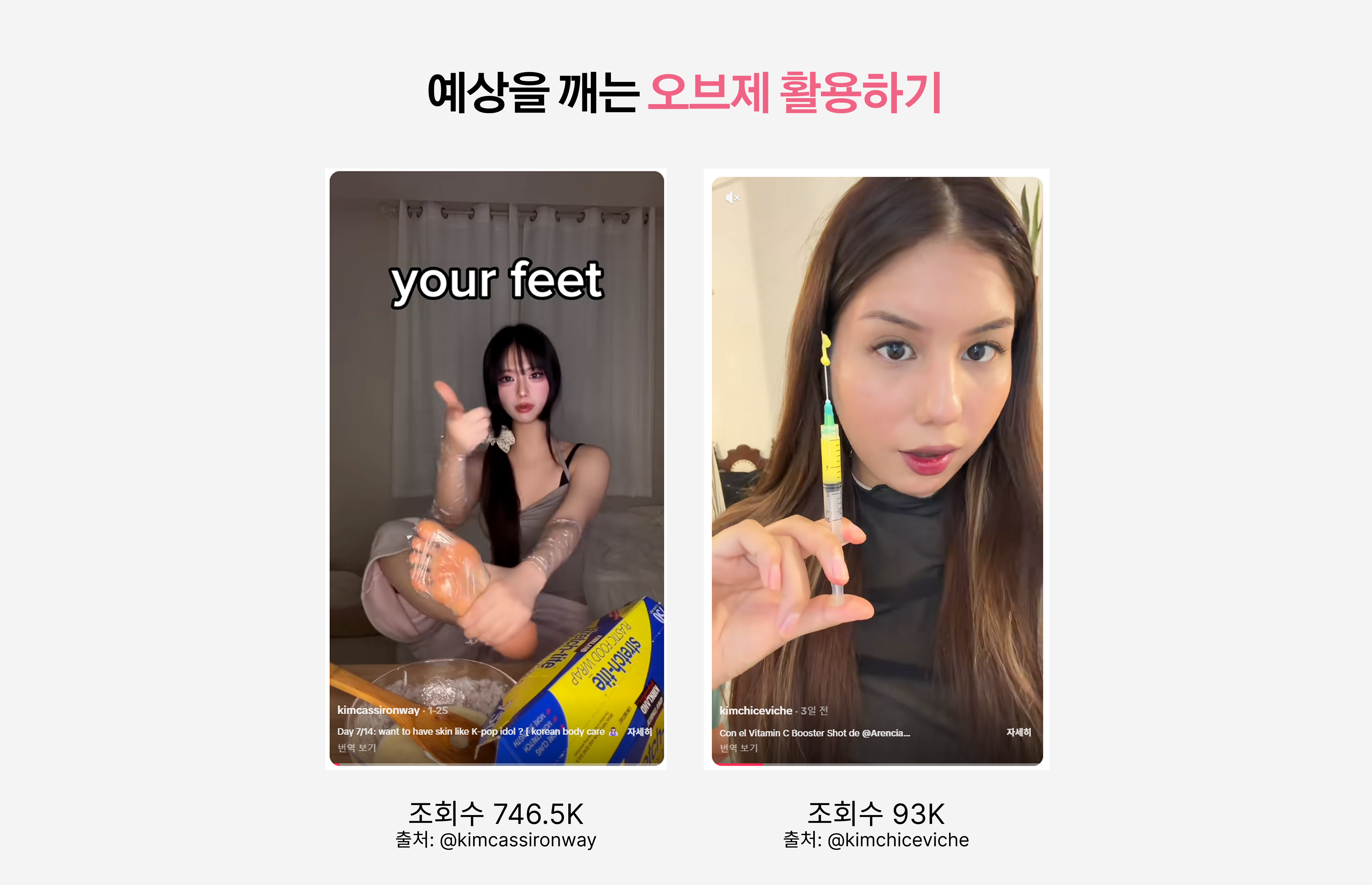 조회수가 높았던 콘텐츠 중엔 '겨울철에 피부가 건조해지기 쉽잖아요'보다는 '겨울철에 입술 각질 많이 일어나는 사람만 보세요', '주름이 슬슬 고민되는 20대 후반만 보세요'처럼 구체적인 대상을 앞단에 지목하는 콘텐츠들도 있었습니다. 타깃을 명확하게 콕 찍어 부르는 순간 '이건 내 얘기잖아'라며 경계심을 해제하고 영상에 몰입하게 되기 때문입니다.