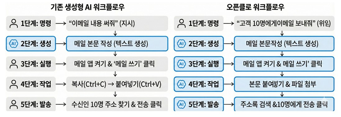 오픈클로를 한 문장으로 설명하면 "화면을 보고 마우스와 키보드를 조작하는 AI 에이전트"입니다. 얼핏 들으면 기존 AI와 비슷해 보일 수 있지만, 그 작동 원리를 뜯어보면 거대한 차이가 있는데요. 예를 들어 10명의 고객에게 이메일을 보내야 하는 상황을 비교해 보면 다음과 같습니다.