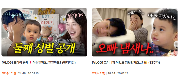 리쥬라이크 채널의 설 주간 업로드 영상인 ‘둘째 성별 공개’ 콘텐츠는 160만 조회수를 넘기며 빠르게 확산됐습니다. 같은 채널의 해당 영상 이전·이후 업로드 두 편이 각각 65만, 85만 조회수를 기록한 것과 비교하면 상승 폭이 확실하죠.