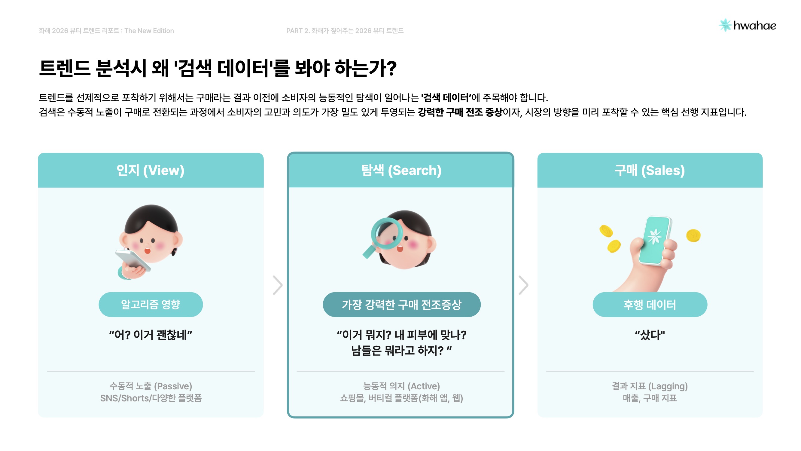그리고 이러한 트렌드를 빠르게 파악하고 분석하기 위해서는 구매(Sales)라는 후행 데이터가 아니라, 능동적인 탐색이 일어나는 '검색(Search) 데이터'에 주목해야 합니다. 단순 알고리즘 노출이 구매로 이어지기 전, 소비자가 "내 피부에 맞나? 남들은 뭐라고 하지?"라며 능동적으로 탐색하는 과정이야말로 '가장 강력한 구매 전조증상'이기 때문입니다.