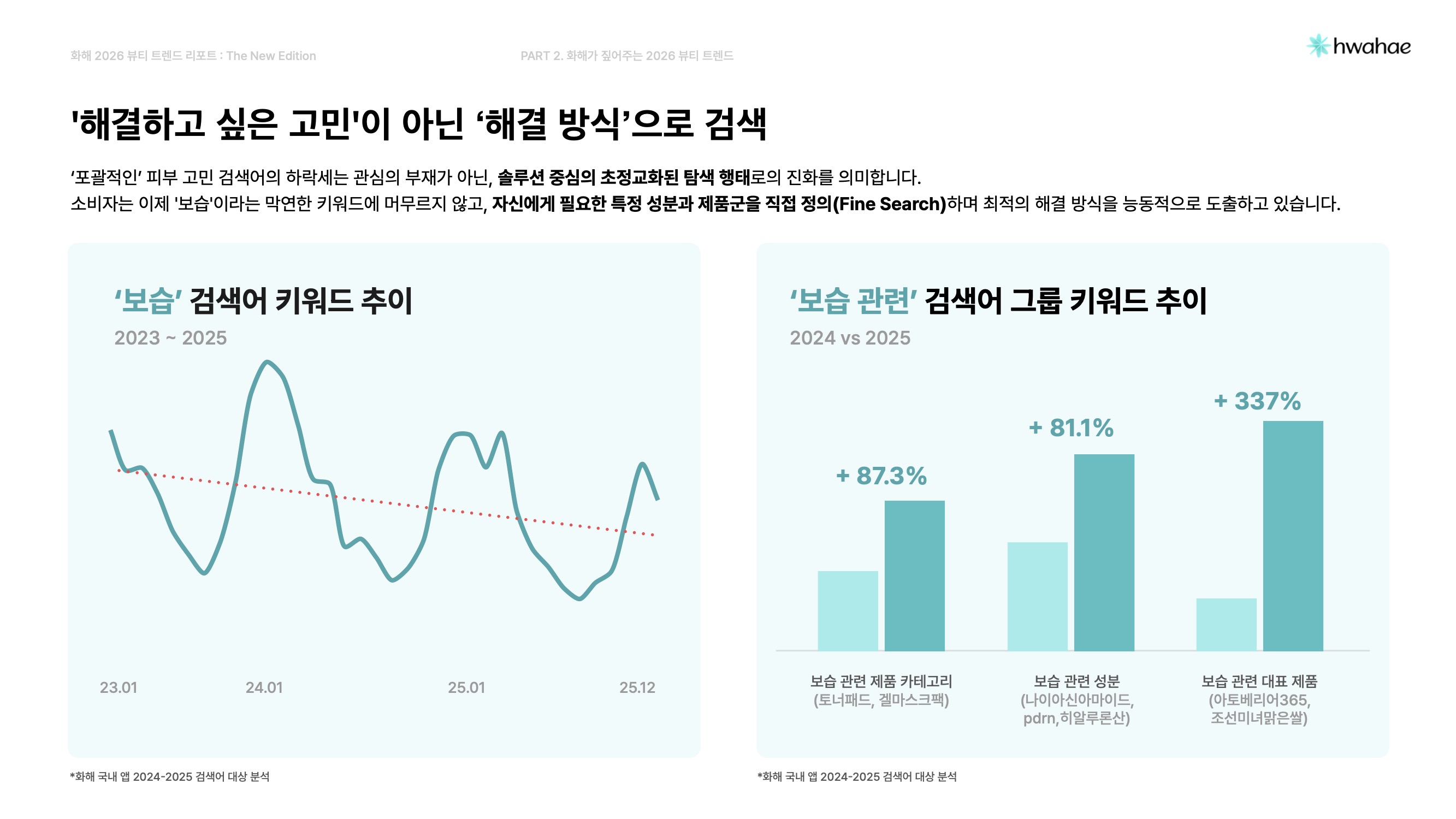 화해 앱 내 검색어 데이터를 분석한 결과, 놀라운 변화가 포착되었습니다. '보습' 같은 포괄적인 피부 고민 검색어는 오히려 하락세를 보였는데, 이는 관심이 줄어든 것이 아니라 '솔루션 중심의 초정교화된 탐색'으로 진화했음을 의미합니다.