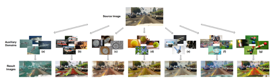 이미지 피라미드. 시뮬레이션에서 얻은 원본 소스 이미지와 실제 세상의 다양한 이미지인 보조 도메인을 통해 결과 이미지를 만든다. AI는 변형된 수많은 이미지들을 보며 ‘색이나 질감이 아무리 바뀌어도 이건 도로구나’라는 본질을 학습한다. 출처: < Domain Randomization and Pyramid Consistency> (Yeu at el., 2019)