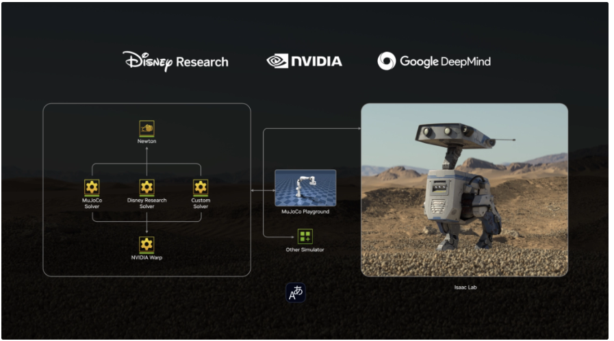NVIDIA 기술 기반으로 하는 Newton 아키텍처. 다양한 시뮬레이터에서 동작한다. 출처: < Announcing Newton, an Open-Source Physics Engine for Robotics Simulation >(Huang et al., 2025)